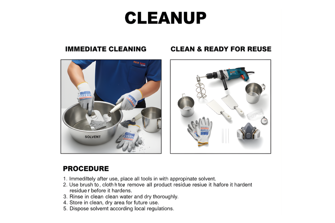 • Clean tools immediately after use with an appropriate solvent or cleaner before the material hardens.