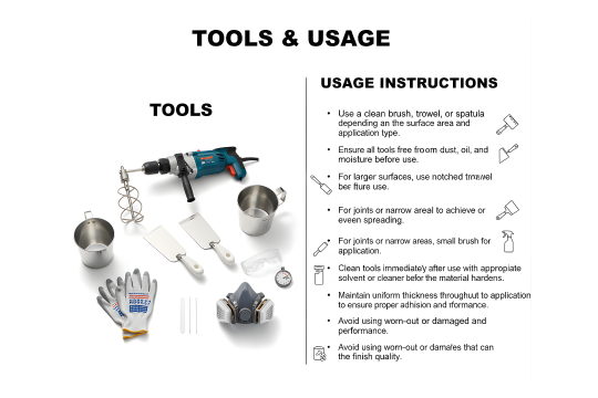 • As the dried product is very difficult to remove, clean all tools and surfaces immediately after use.